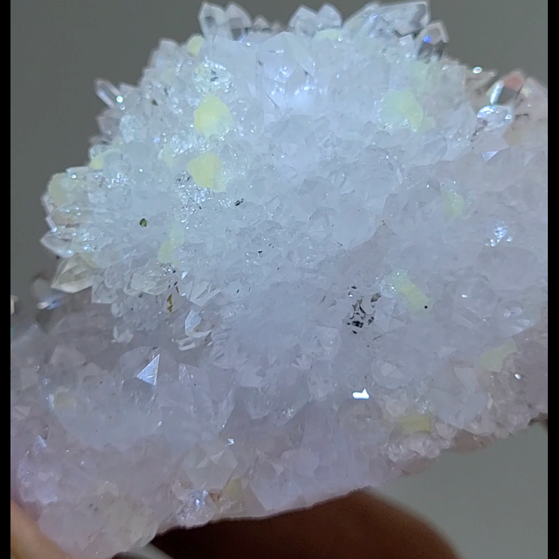 Botryoidal bubble green prehnite on chrysanthemum flower quartz with tons of rainbows. ✨ Origin: China ✨ Measurements: 68.5mm x 48.5mm x 35mm ✨ Weight: 81.7g ✨ FREE WORLDWIDE SHIPPING! ✈️ Botryoidal prehnite on chrysanthemum quartz combines the energies of healing and spiritual expansion. This crystal duo promotes heart-centered healing and emotional balance. Prehnite enhances your connection with nature and the divine. It fosters inner peace and tranquility, encouraging spiritual growth and self-discovery. This crystal combination is a gentle and nurturing companion on your path of healing and spiritual awakening. CQ108 #FeatherlightdustClearQuartz #FeatherlightDustClusters #FeatherlightDust #chrysanthemumquartz #needlequartz #pineapplequartz #flowerquartz #rainbowquartz #hematite #yellowhematite #redhematite #girasol #girasolquartz #rainbowgirasol #rainbowgirasolquartz #hematitequartz #dendritic #dendrites #dendriticquartz #diamondchrysanthemum #diamondflowerquartz #prehnite #greenprehnite