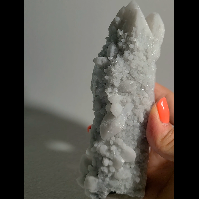 A: Cleanse with smoke, sound, or moonlight monthly; avoid water which may affect calcite inclusions. The quartz self-purifies but appreciates energetic refresh for optimal performance.