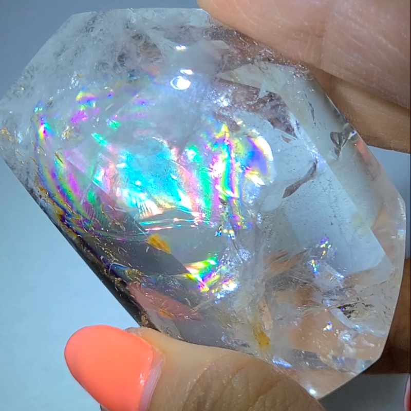 A: Natural internal fractures, fissures, or inclusions within the clear quartz refract light like tiny prisms, separating white light into full rainbow spectrum.
