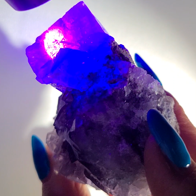 Purple-edged cubic window fluorite with purple phantom and a giant cube of UV-reactive optical calcite with stunning rainbows - FL216 Purple-edged cubic fluorite aids in mental focus and promotes mental clarity, enhancing your concentration and decision-making abilities. Its vibrant purple color stimulates your crown chakra, facilitating spiritual connection and intuition. Purple-edged cubic fluorite also promotes emotional stability and balance, allowing you to navigate challenges with ease. It has a unique energy that can help you expand your spiritual awareness, gain mental clarity, and find inner harmony. #FeatherlightDustFluorite #FeatherlightDustClusters #FeatherlightDust #fluorite #fluoritecubes #cubicfluorite #cubefluorite #fluoritecube #fluoritedruzy #yindu #yindufluorite #yindumine #windowfluorite #cubefluorite #phantomfluorite #purplefluorite #bluefluorite #greenfluorite #rainbowfluorite #enhydrofluorite #phantomfluorite #fluoritewithphantom #uvreactive #uvreactivecrystals #uvreactivecalcite #calcite