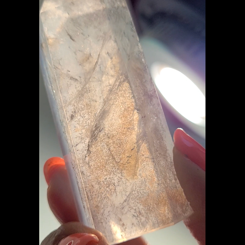 A: Cleanse with moonlight, smoke, or sound. Rose quartz fades in direct sunlight; avoid prolonged sun exposure. Handle tower carefully to protect pointed termination from damage.