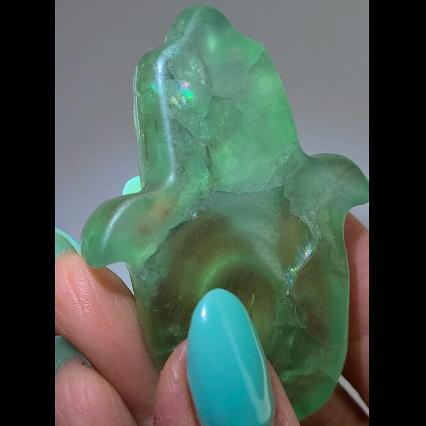 Fluorite hamsa combines the ancient protective power of the hamsa symbol with fluorite's legendary spiritual enhancement properties, creating a powerful talisman for comprehensive spiritual protection and guidance. This carved specimen features tons of rainbows that amplify both protective and spiritual development energies while promoting spiritual discernment and psychic protection throughout your awakening journey.