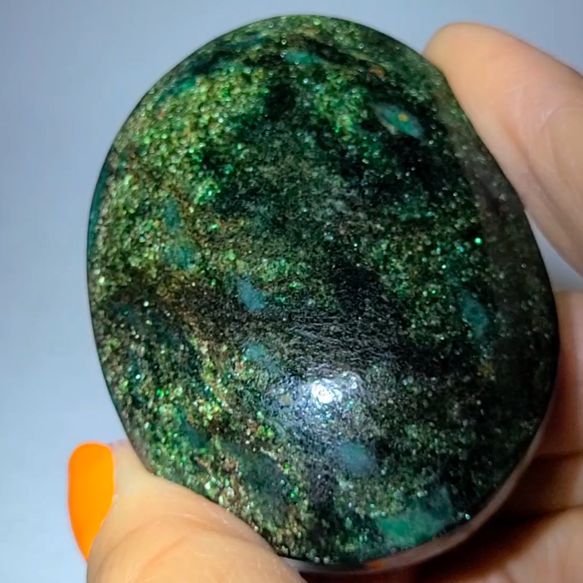 This stunning Brazilian specimen combines the heart-healing properties of fuchsite with shimmering gold and green mica in perfect palm stone formation. Fuchsite is a chromium-rich variety of muscovite mica known for its exceptional ability to stimulate heart chakra healing while aligning spiritual growth with practical earth wisdom. The gold mica adds prosperity consciousness and solar plexus activation, while green mica enhances nature communication and earth connection.