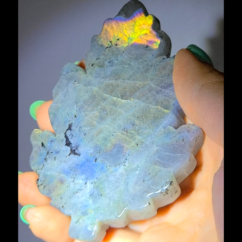 A: The leaf shape connects practitioners to nature's wisdom and growth cycles, while the carved form creates additional energy focus points that amplify labradorite's transformation properties.