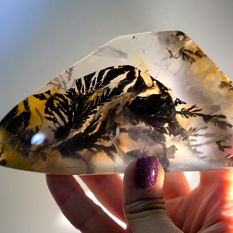Palm leaf dendritic and golden healer in girasol quartz slab, with rainbows all over. A rare collector's piece. ✨ Origin: Brazil ✨ Measurements: 132.9mm x 73.3mm x 18mm ✨ Weight: 257.7g ✨ FREE WORLDWIDE SHIPPING! ✈️ Dendritic in girasol quartz exudes a commanding and transformative energy, propelling your spiritual evolution and growth. It enhances your intuition and connection to higher realms, facilitating profound insights and spiritual guidance. Dendritic in girasol quartz promotes emotional healing and inner peace, bringing tranquility and serenity to your being. It nurtures a deep sense of connection with nature, fostering harmony and alignment. Dendritic in girasol quartz also amplifies your manifestation abilities, empowering you to manifest your desires and attract abundance into your life. DN47 #featherlightdustdendritic #featherlightdustgoldenhealer #featherlightdustcollectors #FeatherlightDust #dendritic #dendriticgoldenhealer #goldenhealer