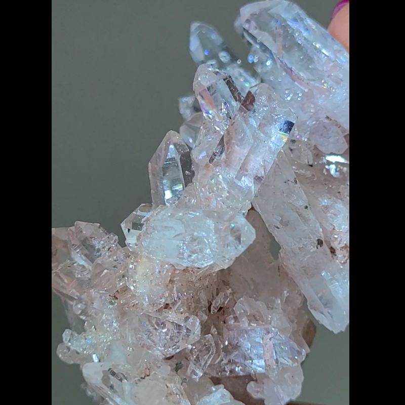 This is a super pink Pink Lemurian cluster with double terminations, stunning rainbows, incredible clarity, and ascension lines. ✨ Colombia ✨ Measurements: 74mm x 37mm x 35mm ✨ Weight: 44.1g ✨ FREE SHIPPING! Ascension lines are those horizontally-banded, striped growth patterns on each crystal point. These lines are energetic pathways that support spiritual evolution, growth, and the opening of higher consciousness. The pink coloration is due to the presence of microscopic mineral inclusions within the quartz structure. The intensity of the pink color is saturated throughout the cluster. This cluster also exhibits a double-terminated form, meaning the crystals have point-like terminations on both ends, rather than single terminations. There are beautiful prismatic rainbows that reflect off the quartz's surfaces when the light hits. Pink Lemurian is a crystal that brings love, compassion, and spiritual connection into your life. Its gentle pink hue symbolizes emotional healing and divine love. Pink Lemurian supports your spiritual journey by strengthening your connection to the divine and deepening your spiritual practice. LQ161 #FeatherlightDustLemurian #FeatherlightDust #Lemurian #Lemuria #lemurianquartz #lemurianseed #santander #Colombia #colombianlemurian #SantanderLemurian #ColombiaLemurian #seedcrystal #seedquartz #lemuriancrystal #bladesoflight #pinklemurian #pinklemurianquartz #pinklemurianseedcrystal #pinklemuriancluster #pinklemurians #pinklemurianseed #pinklemuriancrystal