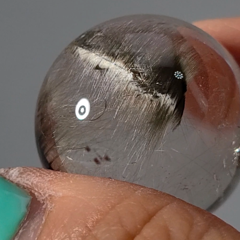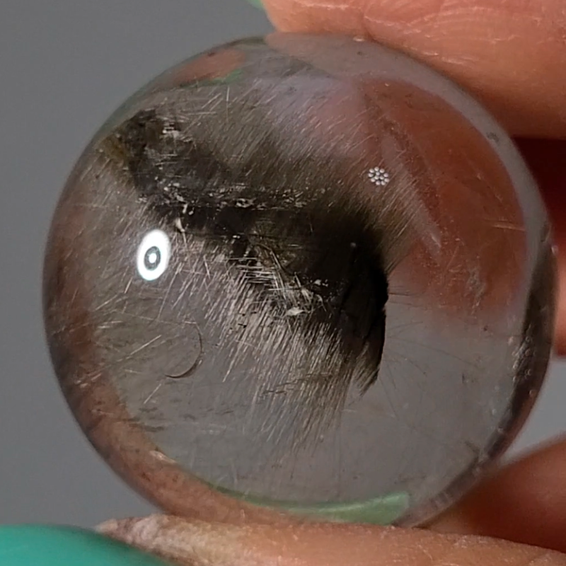 This exceptional Brazilian specimen showcases rare silver rutile inclusions forming distinctive fishbone-like shapes with criss-crossing lattice patterns and parallel phantom lines throughout clear quartz. Silver rutiles are significantly rarer and more desirable than common golden varieties, requiring specific trace elements and unique growth conditions for their silvery coloration. The fishbone formation creates powerful energetic pathways while the sphere shape amplifies rutile's illuminating properties for enhanced spiritual connection and mental clarity.