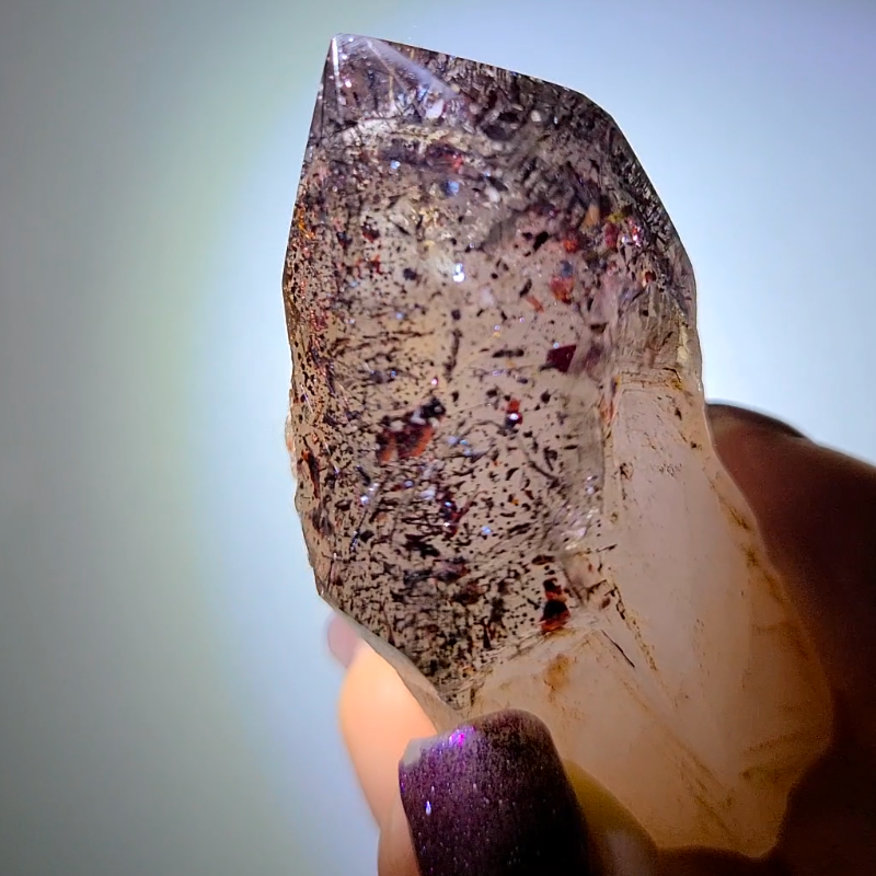 Super 7 scepter jam-packed with big red hematite inclusions and rainbows. Measurements: 67mm x 37mm x 29mm Weight: 64.6g Locale: Namibia Super 7 crystals combine the powerful energies of seven minerals, harmoniously working together for your spiritual growth and transformation. It amplifies your intuition, activates your higher chakras, and accelerates spiritual awakening. Super 7 enhances psychic abilities and facilitates spiritual communication. It purifies and aligns your energy field, promoting balance and protection. Super 7 also stimulates personal growth, empowers manifestation, and fosters a deep connection with divine guidance. S748 #featherlightdustsuper7 #FeatherlightDust #namibia #Namibiansuper7 #super7 #superseven #Namibiansuperseven #Namibiasuper7 #namibiasuperseven #super7scepter #supersevenscepter #hematite #redhematite