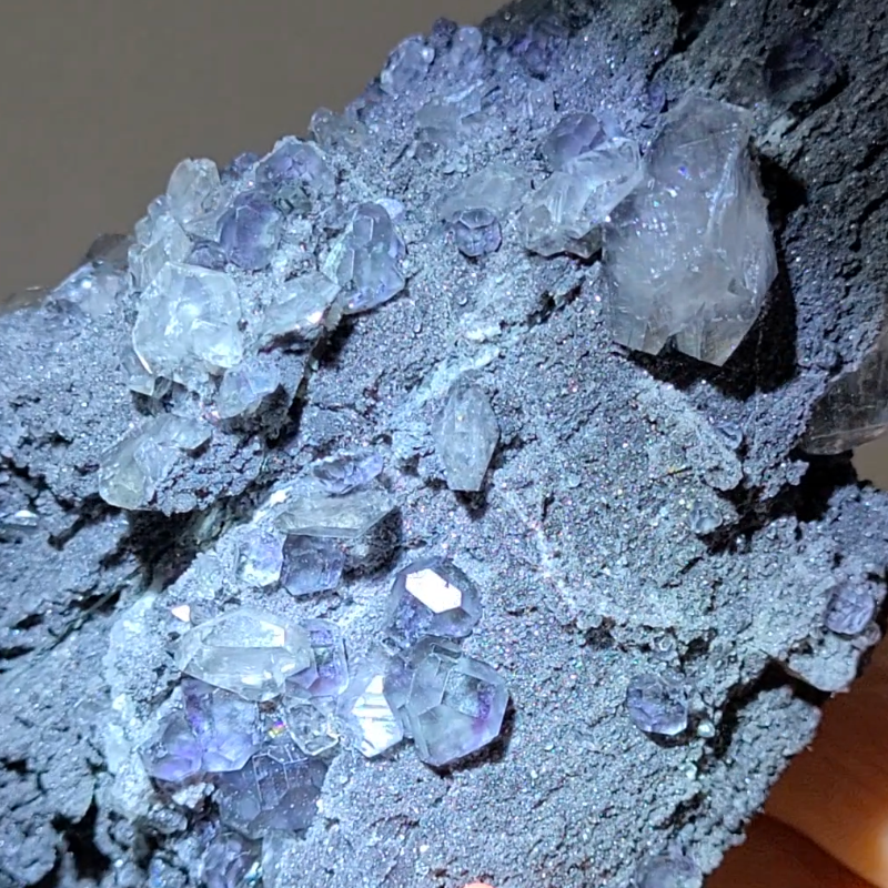 Tanzanite fluorite combines the mental clarity of fluorite with UV-reactive rainbow diamond calcite's emotional balancing properties, creating a comprehensive tool for psychic development and spiritual growth. The sparkly quartz matrix amplifies both minerals' energies exponentially.